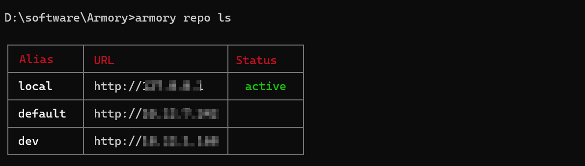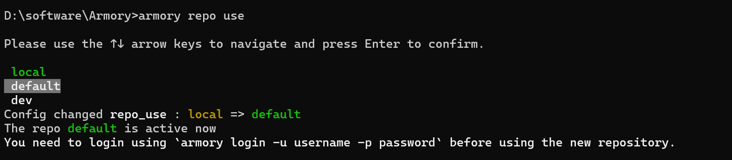 armory repo use <alias>切换至目标仓库。或执行如下命令,通过键盘上下键选择目标仓库地址,并按“Enter”键完成选择。armory repo use