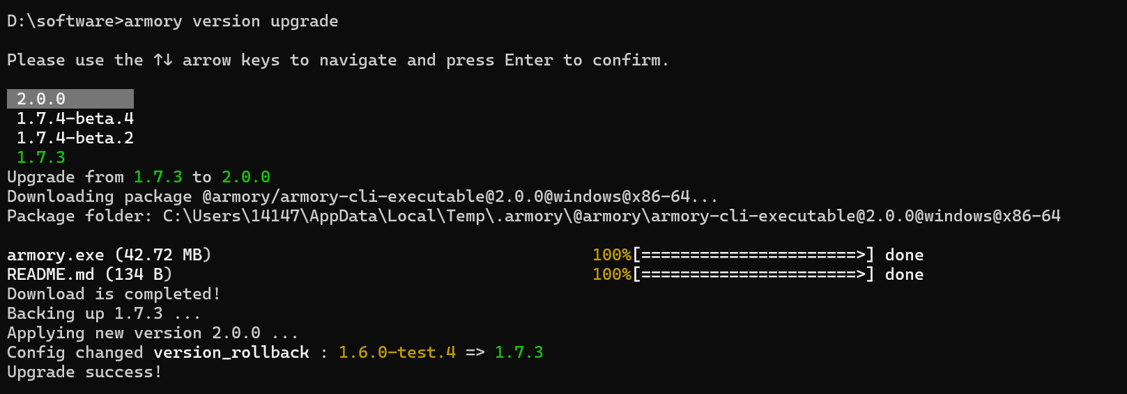 armory version upgrade系统会默认选中最新版本,您也可以通过键盘上下键选择要更新的版本,并按“Enter”键确认,系统将根据您选择的版本进行客户端更新。此处以更新客户端版本至 2.0.0 版本为例进行介绍。