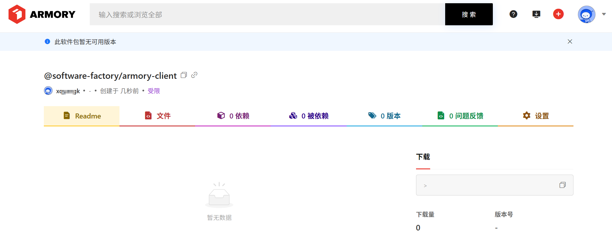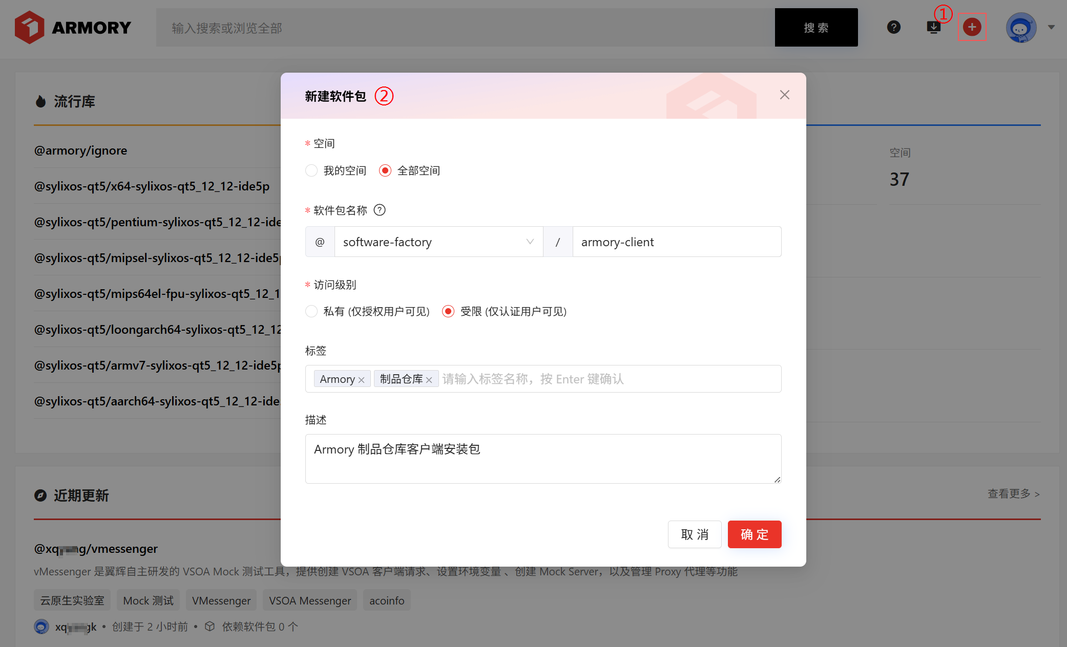 参数 描述 示例 空间类型 选择软件包归属的空间范围,可选“我的空间”或“全部空间”。其中,“我的空间”用于快速定位个人命名空间,可省去后续选择空间的步骤 全部空间 软件包名称 软件包的唯一标识,由 命名空间 和软件包名组成。仅支持中文、小写字母、数字和特殊字符“-”、“_”,且长度不能超过 50 个字符 package-name 访问级别 设置软件包的可见范围,可选“私有”或“受限”。如需设置为“公开”,需在新建后联系系统管理员 切换访问级别,各级别详细介绍请参见 访问级别 受限 标签 用于对软件包进行分类或标记,支持配置多个标签。每个标签不超过 50 个字符,总数量不超过 50 个 Armory 描述 软件包的简要说明,建议概括其功能、用途等,最长不能超过 1024 个字符 - 单击确定,完成软件包新建。页面右下角将显示新建成功提示,可通过该提示进入软件包详情页查看信息。新建的软件包初始为空,请参见 发布软件包 发布具体内容。