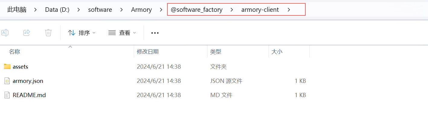 创建完成后,进入命令行工作目录(如 D:\software\Armory),可以看到以 namespace 命名的文件夹,创建的软件包也包含在内。软件包目录结构如下图所示,可以参考 软件包规范 配置 armory.json 以及具体要发布的文件集,以快速 发布软件包。