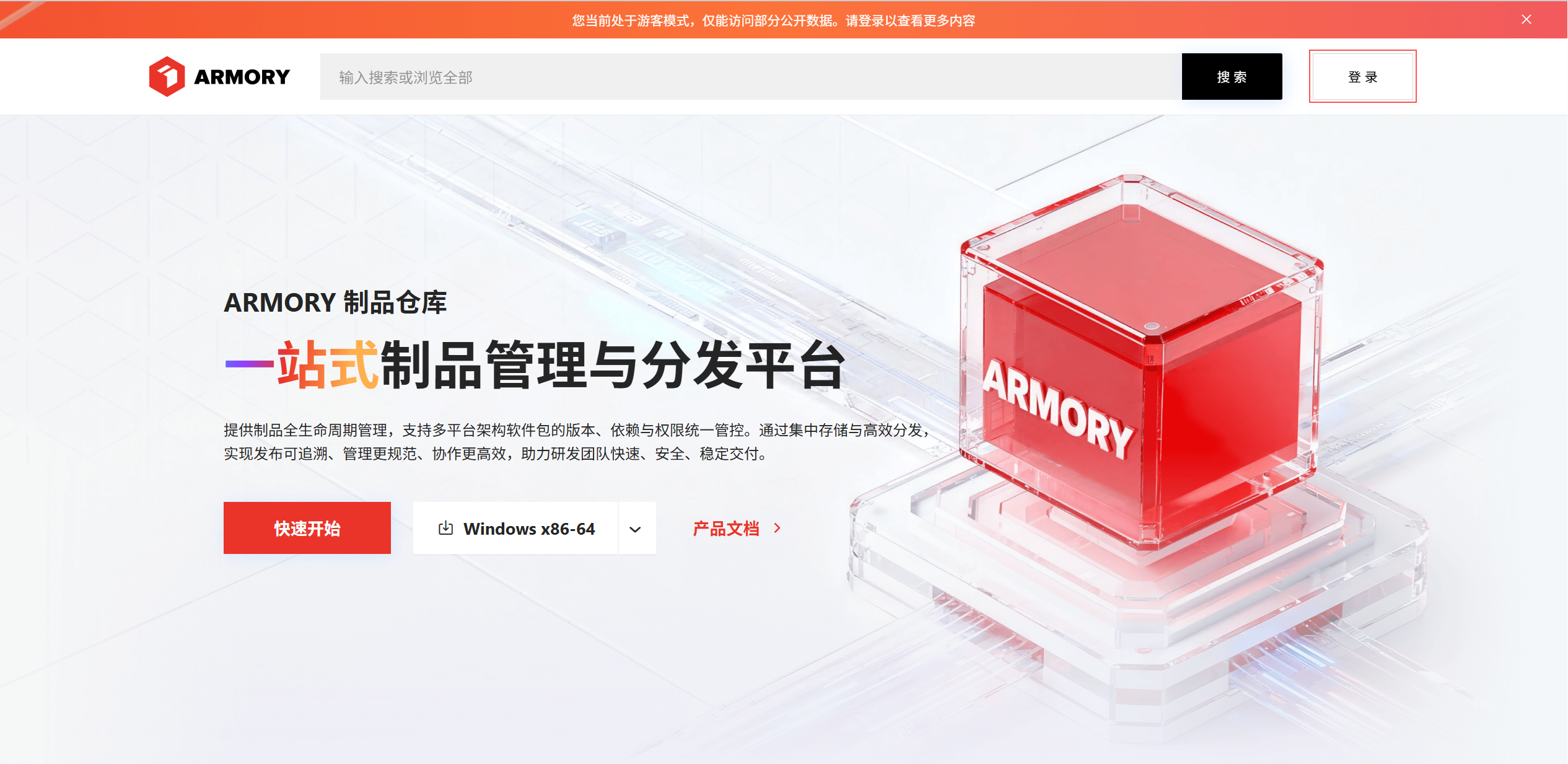 在使用 Armory 发布或管理软件包前,需先完成登录操作。本节介绍如何登录 Armory 的 Web 端和客户端。