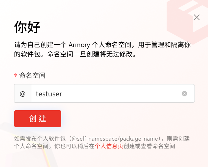 未创建个人命名空间:将进入 Armory 欢迎页。您需要设置个人命名空间名称(默认与用户名一致,可根据需要修改),单击创建后完成初始化并进入主界面。