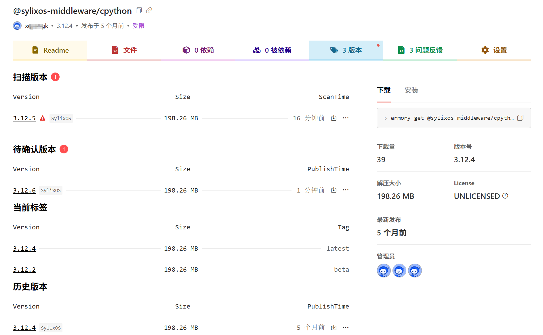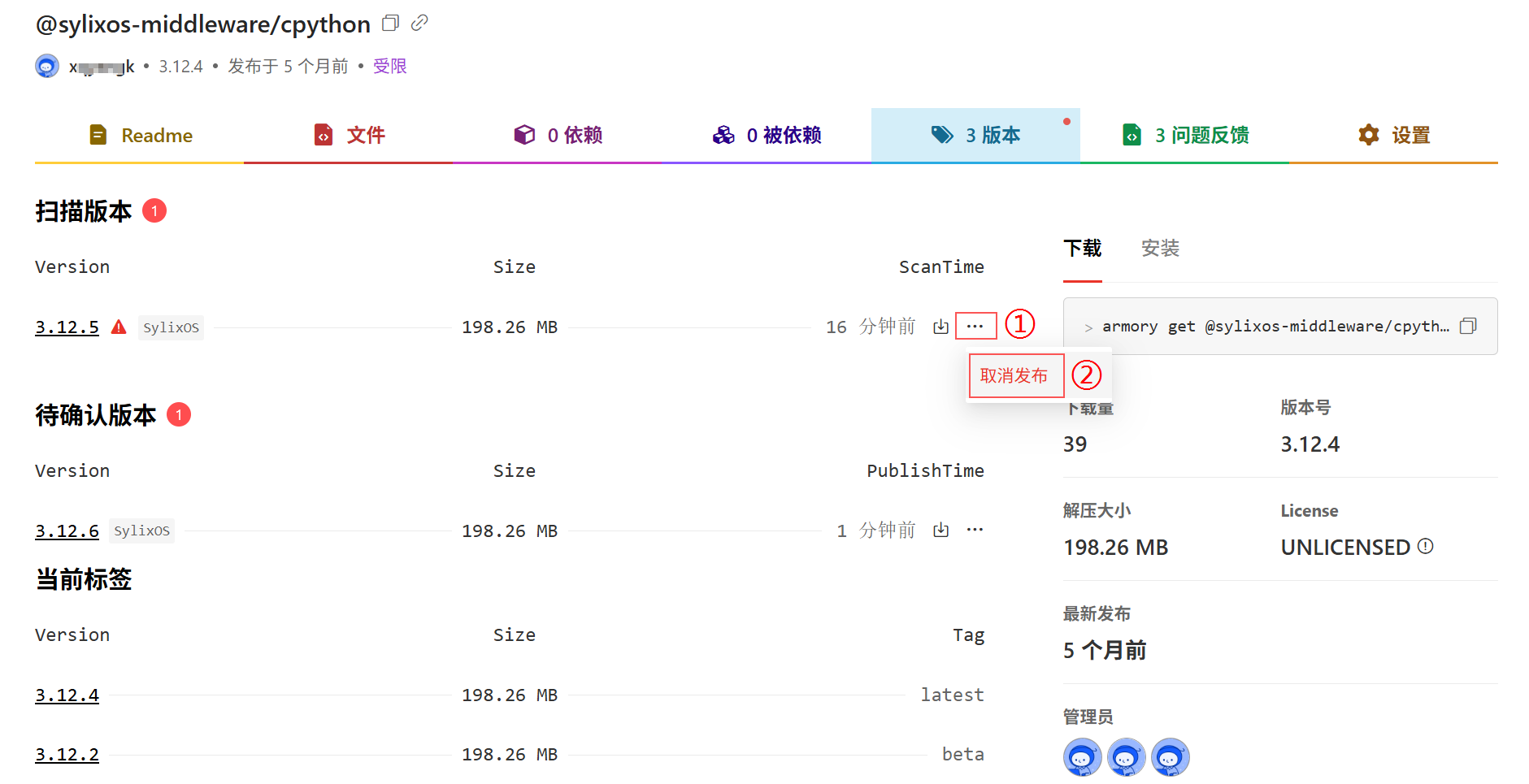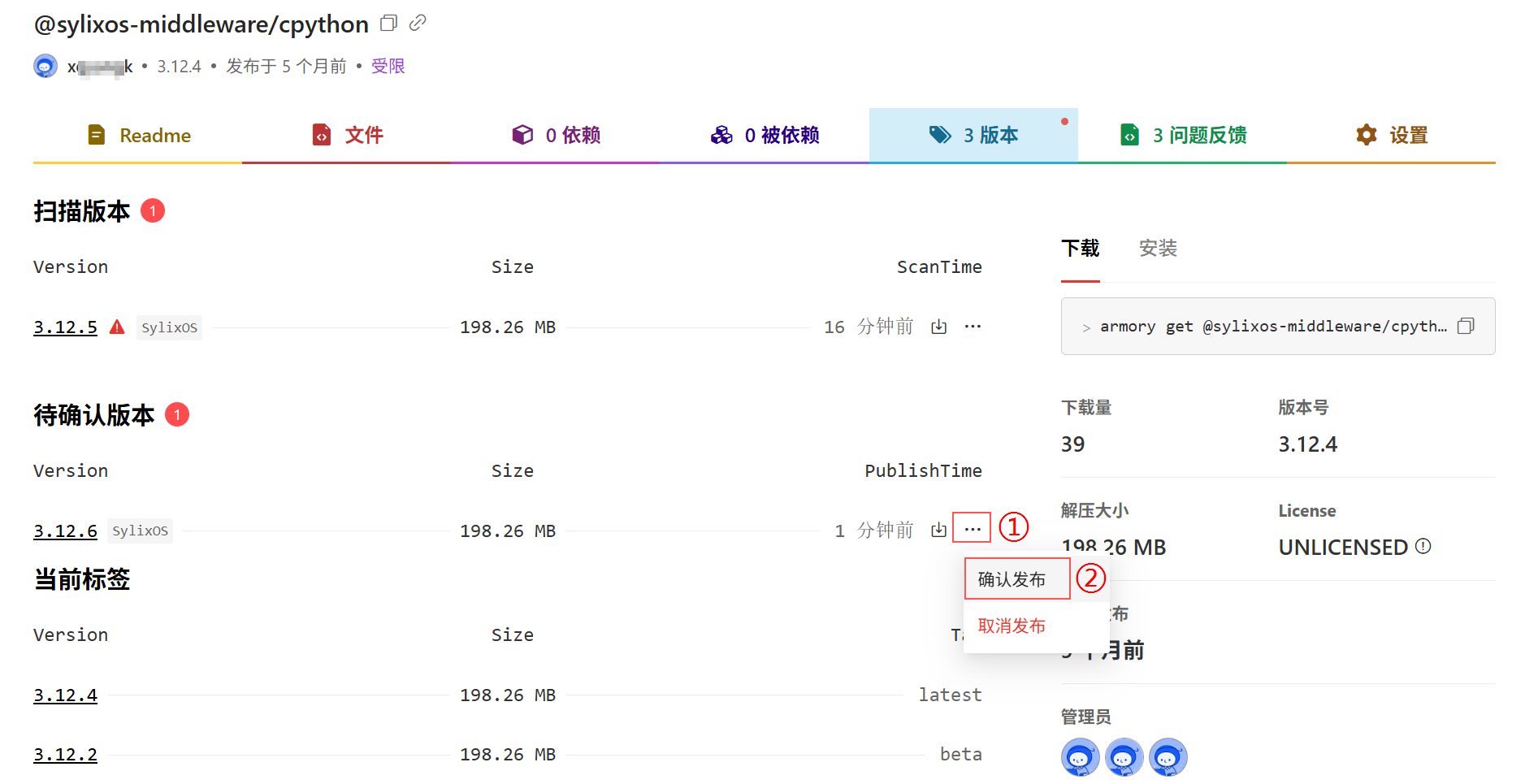 权限说明:空间所有者和空间管理员可确认发布软件包版本;软件包发布者、空间所有者和空间管理员可取消发布软件包版本。