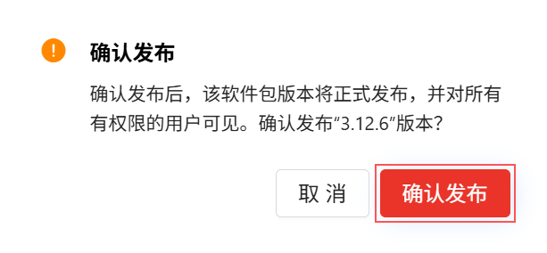 在确认发布弹窗中,单击确认发布。确认发布后,该软件包版本将转为正式版本,所有有权限的用户将可以查看、下载或管理该版本的软件包。