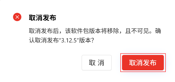 在取消发布弹窗中,单击取消发布。取消发布后,该软件包版本将被移除,对所有用户不可见。