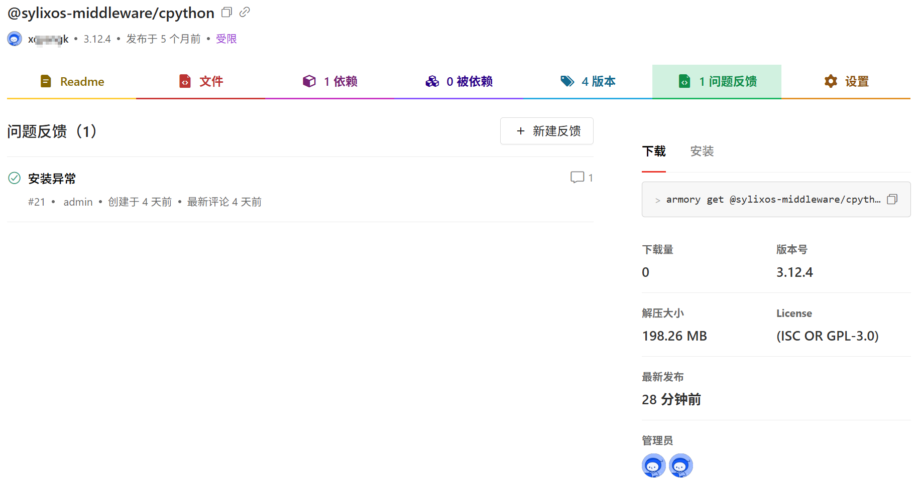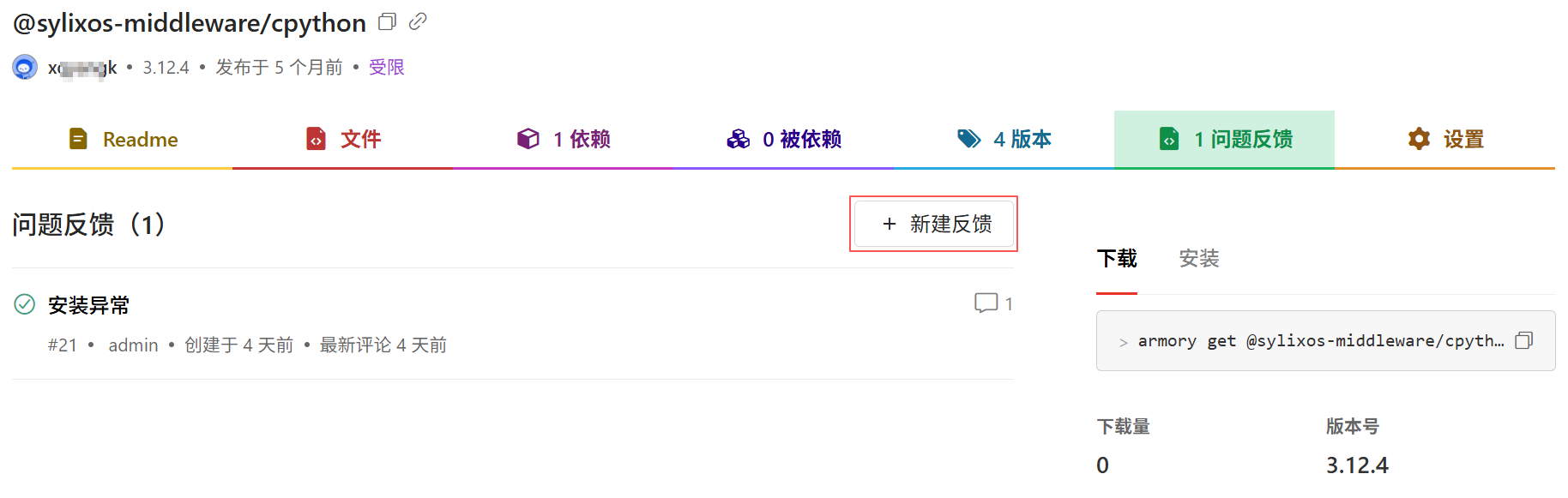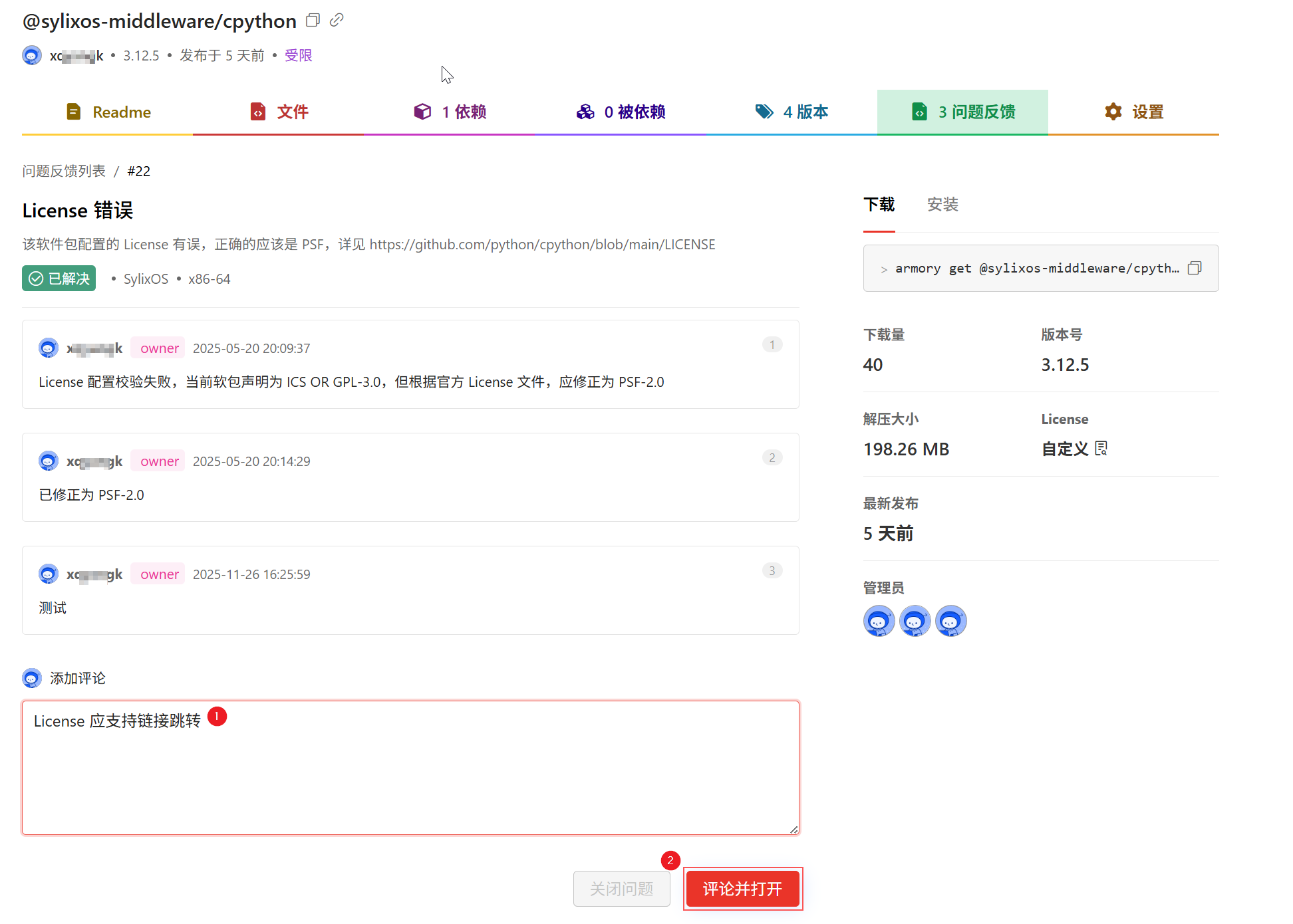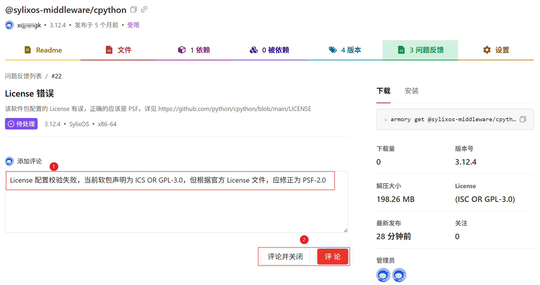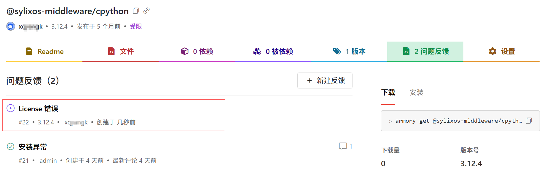 Armory 提供问题反馈功能,用户可提交在使用软件包过程中发现的问题,并可进行补充评论,便于问题的跟踪与协同解决。