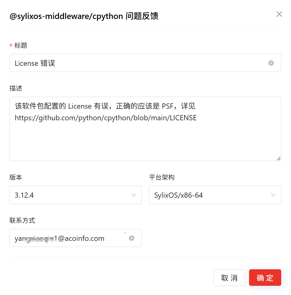参数 描述 示例 标题 问题的简要说明 安装失败 描述 详细描述问题现象,包括复现步骤、实际与预期行为等,便于快速定位处理 无法执行安装脚本,提示权限不足 版本 选择出现问题的软件包版本 1.7.9 平台架构 选择问题发生的平台与架构信息 Windows/x86-64 联系方式 填写邮箱或电话,方便后续联系和问题跟进 user@example.com 单击确定,完成软件包问题反馈。