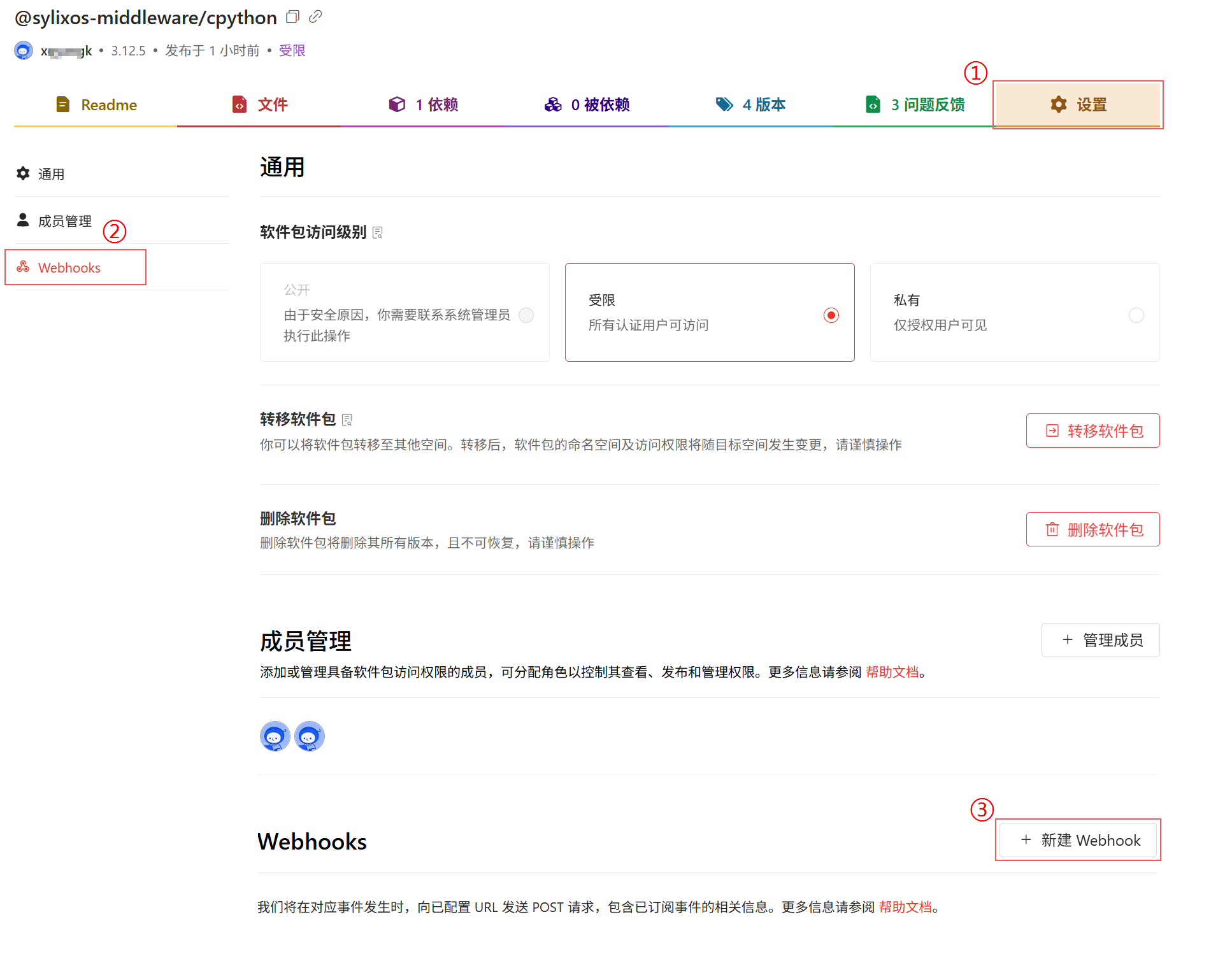 仅空间所有者、空间管理员和软件包管理员可以设置 Webhook。更多权限详情,请参见 权限管理。