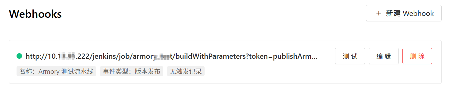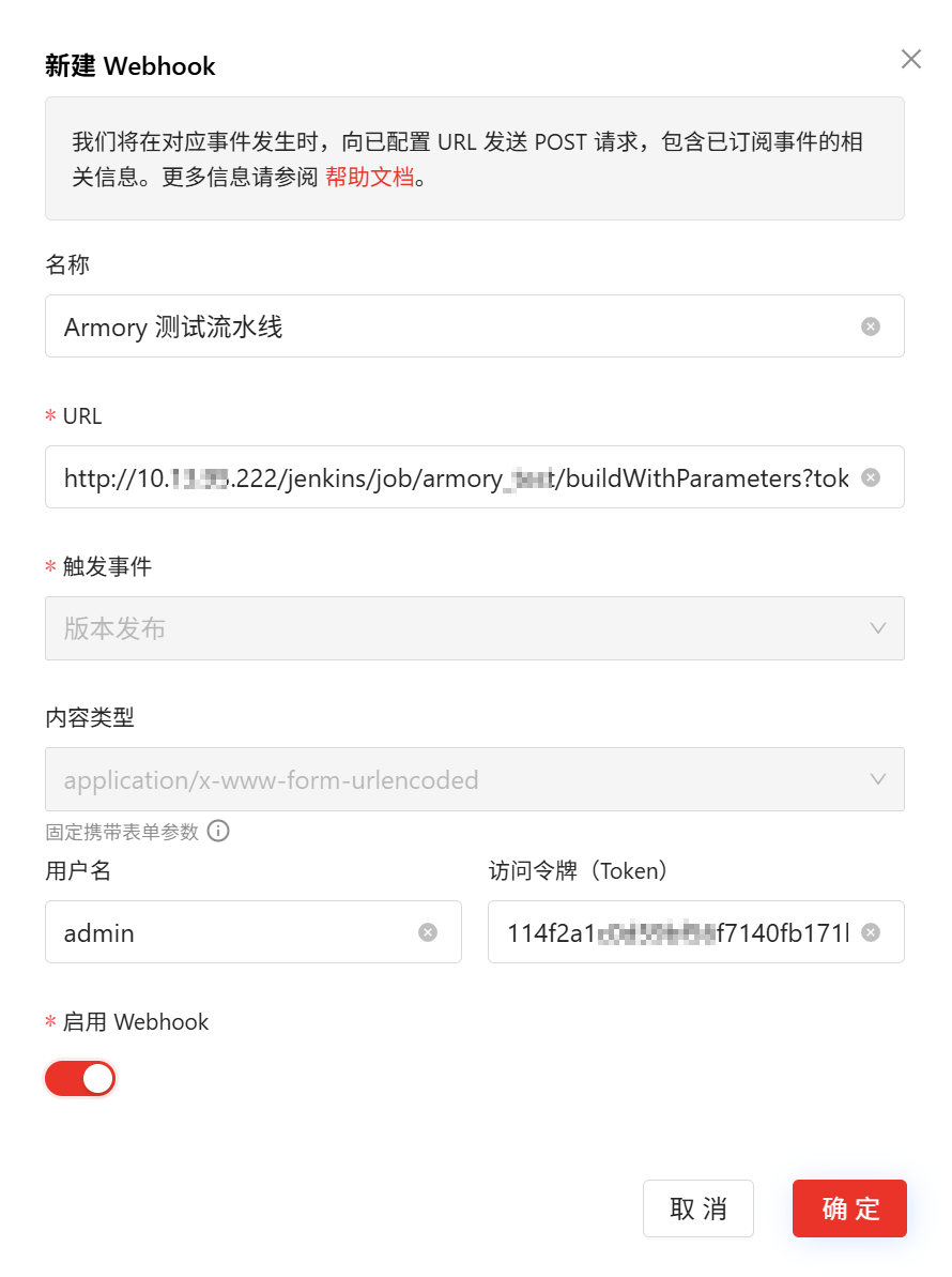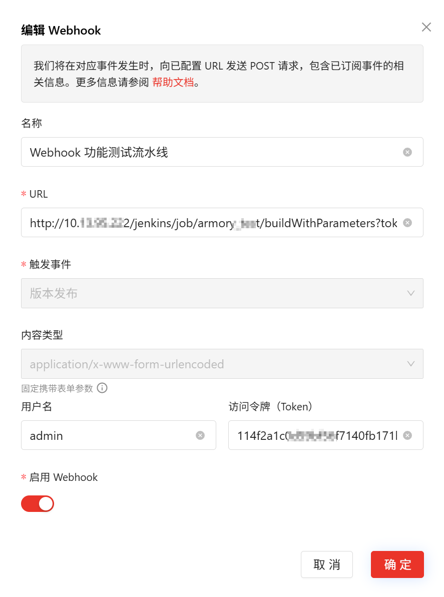 参数 描述 示例 名称 自定义 Webhook 的标识名称,便于识别 自动发布通知器 URL 接收 Webhook 请求的目标地址,需以 http://或https://开头https://ci.example.com/hook 触发事件 指定触发 Webhook 的操作事件,目前仅支持“版本发布” 版本发布 内容类型 设置请求的 Content-Type类型,用于指定请求体格式,目前仅支持application/x-www-form-urlencodedapplication/x-www-form-urlencoded 用户名 用于请求身份验证,常见于用户名密码认证或自定义身份校验场景 admin 访问令牌(Token) 用于验证请求来源是否合法,随请求一并发送 - 启用 Webhook 是否启用当前 Webhook。关闭后将不再发送通知 - 单击提交,完成 Webhook 新建。