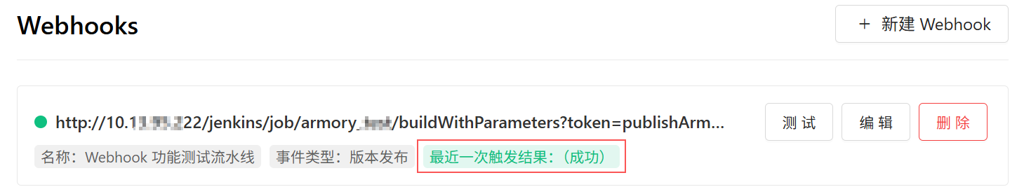 在编辑 Webhook 对话框中,参考 新建 Webhook 中的表 1 修改相关参数设置,并单击提交,完成 Webhook 编辑。