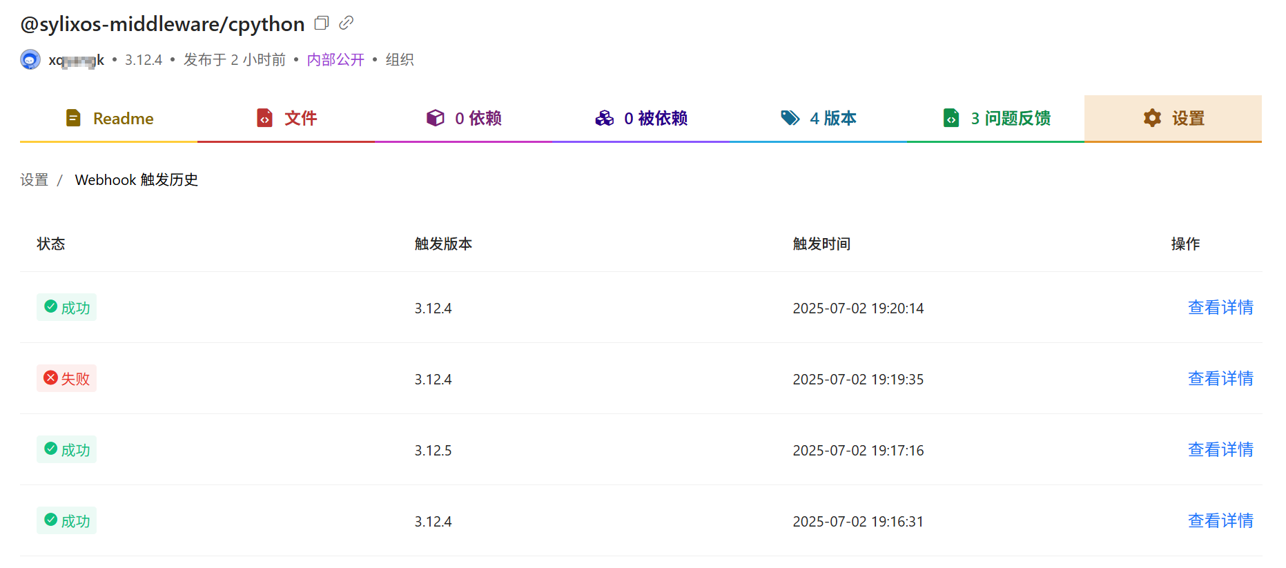 您可以为每个软件包配置 Webhook。当软件包发布新版本时,系统会自动向指定地址发送 POST 请求,实现与外部系统的联动,例如触发自动安装、构建通知、消息推送等操作。