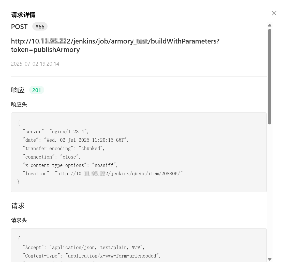 选择要查看详情的触发历史,单击其操作列的查看详情,在请求详情窗口可以查看本次请求的地址、响应头、请求头和请求参数等详细信息。
