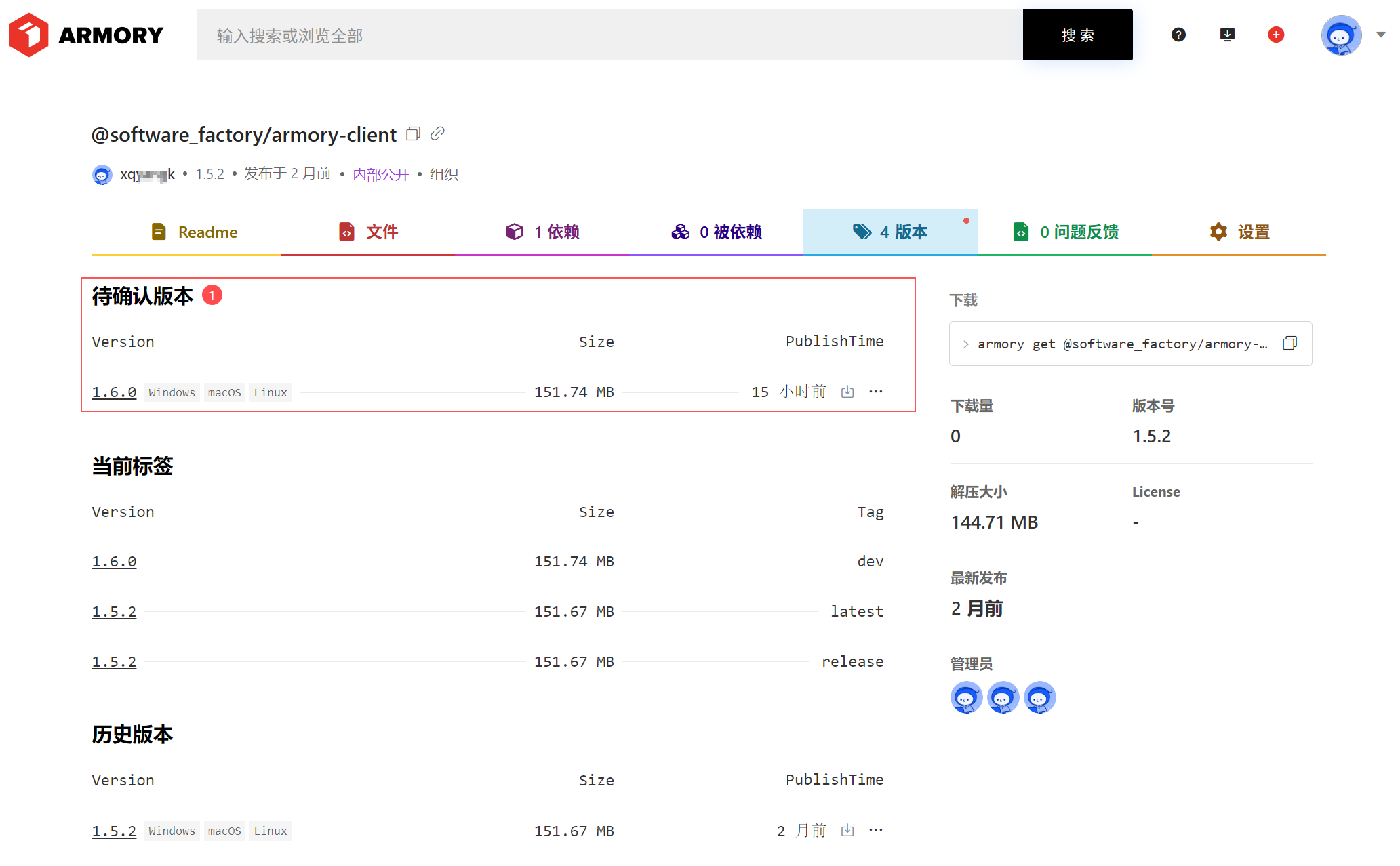 在 Armory 仓库查看软件包:软件包发布结果根据其所属空间设置的“软件包发布确认”策略分以下 2 种情况: