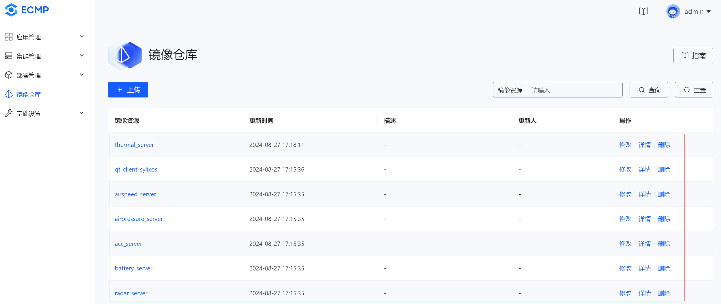 在 ECMP 仓库查看软件包:登录 ECMP,在左侧导航栏中单击镜像仓库,在镜像仓库界面,可以查看已发布软件包所包含的容器镜像资源。