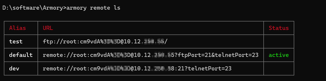 armory remote set <alias>=remote://<username>:<password>@<host>[:port][?ftpPort=21][&telnetPort=23]参数说明如下:
