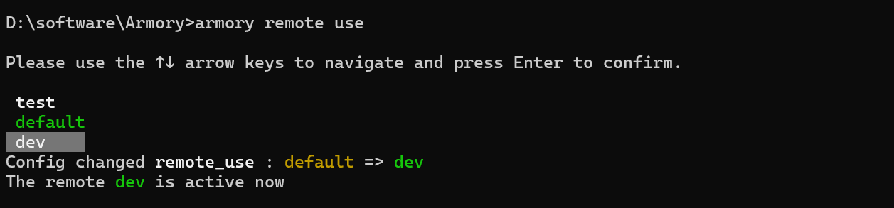 armory remote use <alias>切换至目标远程地址。或执行如下命令,通过键盘上下键选择目标远程地址,并按“Enter”键完成选择。armory remote use