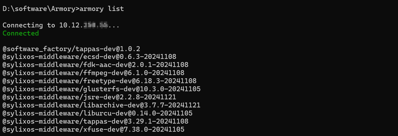 armory list [-r <alias>]其中 alias 为远程计算机的别名,用于指定要查看安装包列表的目标计算机地址。如果不指定,则默认使用激活状态为“active”的远程地址,可通过
