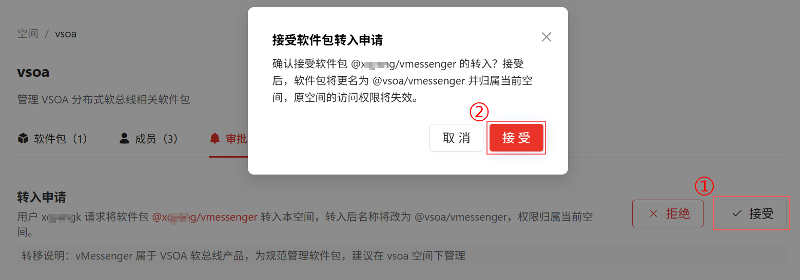 空间所有者可审批转入本空间的软件包申请,按需接受或拒绝。