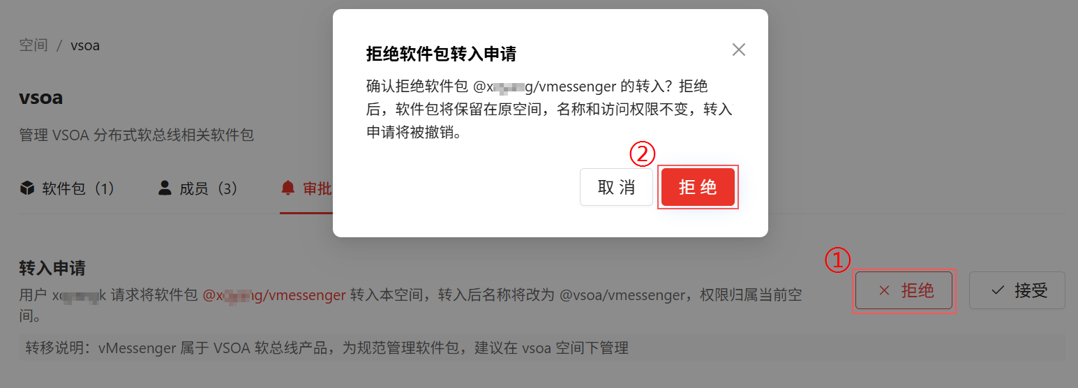 拒绝申请:查看申请详情和说明后,单击拒绝。在弹出的拒绝软件包转入申请确认框中,核对信息后,单击拒绝,软件包将保留在原空间,转入申请将被撤销。