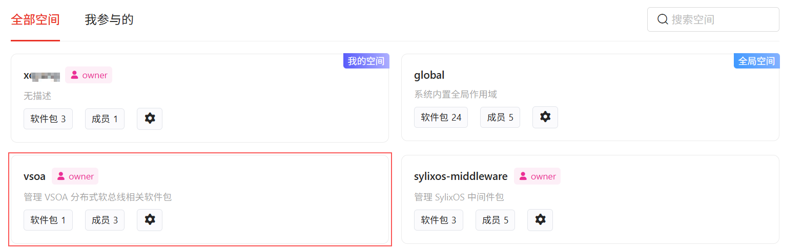 在空间页面,通过切换页签或搜索查找目标空间,单击空间名称进入详情页。