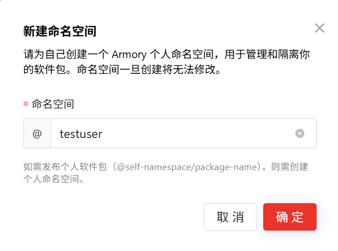 首次使用 Armory 时,系统会弹出“创建个人命名空间”界面。若需发布个人软件包,建议按提示创建命名空间。也可跳过该步骤,后续按以下方式创建: