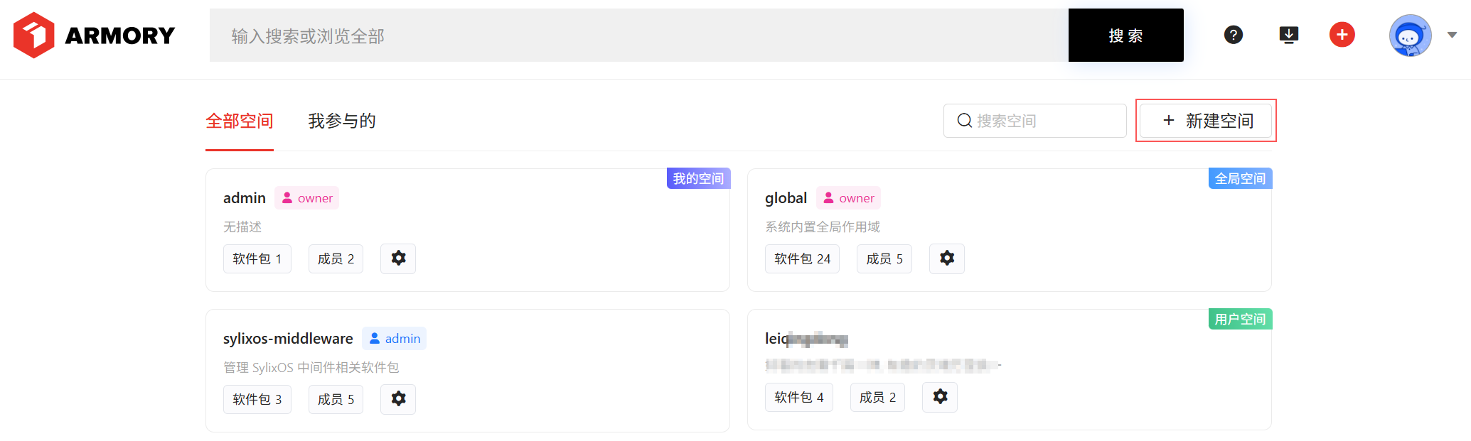 Armory 支持新建空间,通过空间来管理项目成员及项目软件包的读写权限,方便团队协作的同时,保证了软件包的安全性和合规性。