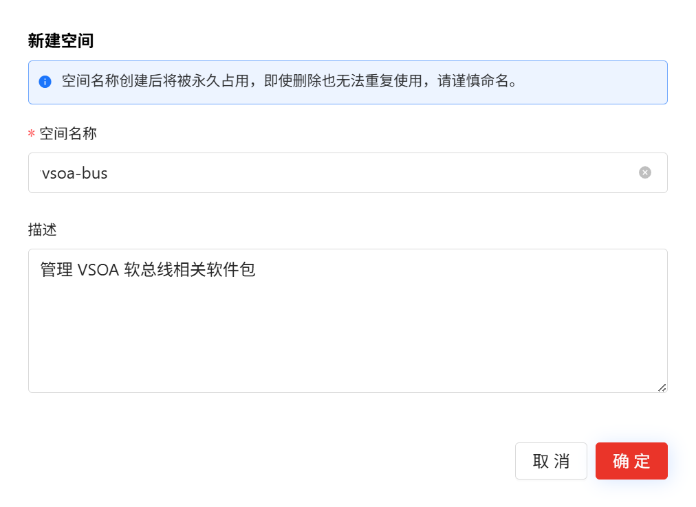 在新建空间对话框中,输入空间名称和描述。其中空间名称由中文、小写字母、数字和特殊字符“-”、“_”组成,且长度不能超过 30 个字符;空间描述长度不能超过 1024 个字符。