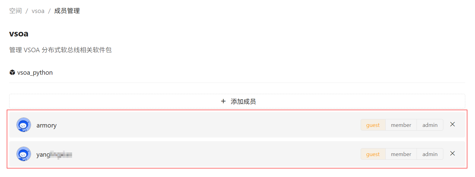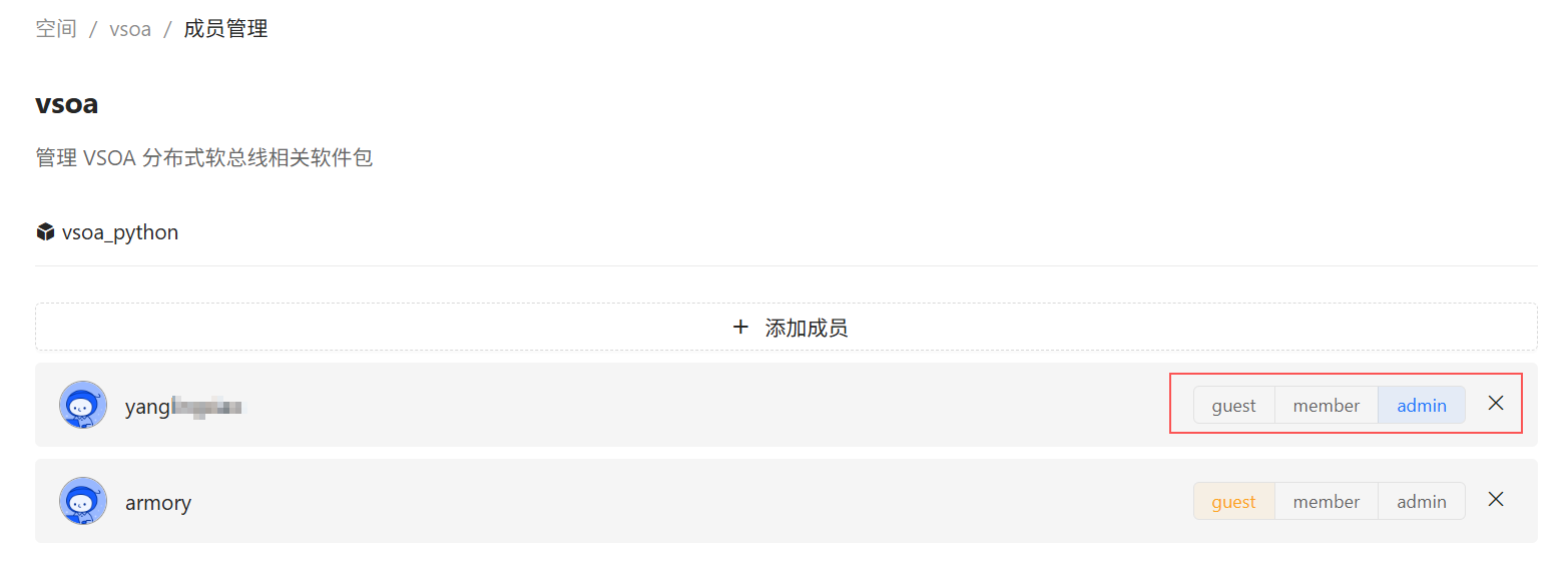 空间所有者和空间管理员拥有管理空间内软件包的权限,可对软件包成员进行添加、修改角色和删除操作。本节重点介绍软件包成员管理的相关操作。