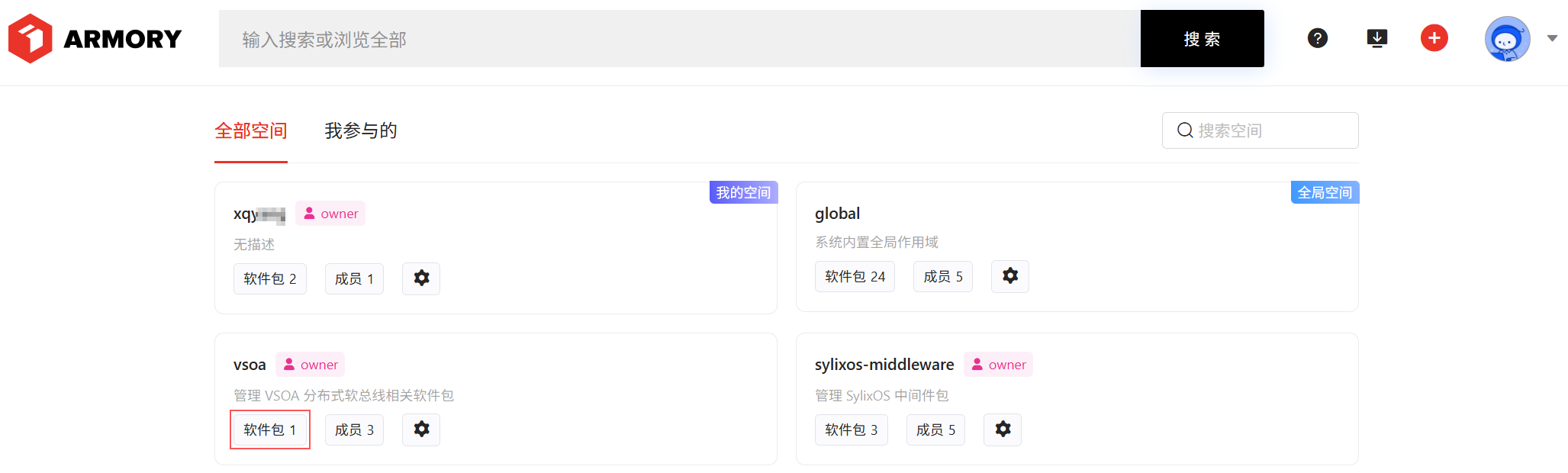 在空间页面,通过切换页签或搜索查找目标空间,单击该空间卡片中的软件包,进入空间软件包页签。