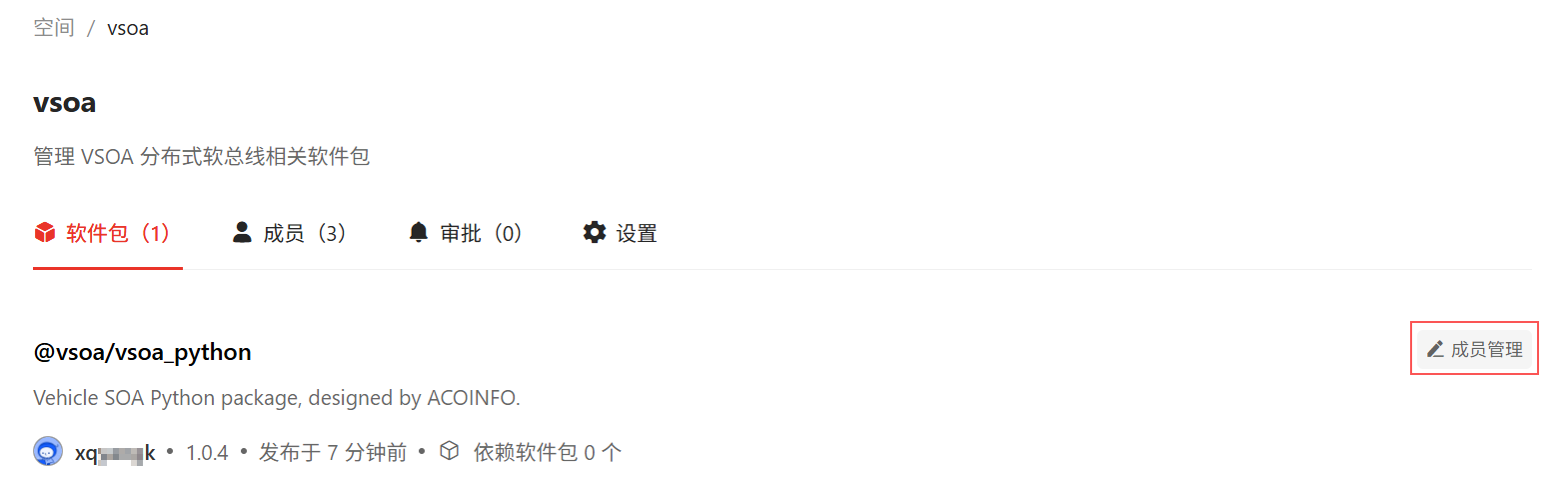 在空间软件包页签,单击成员管理,进入成员管理页面。